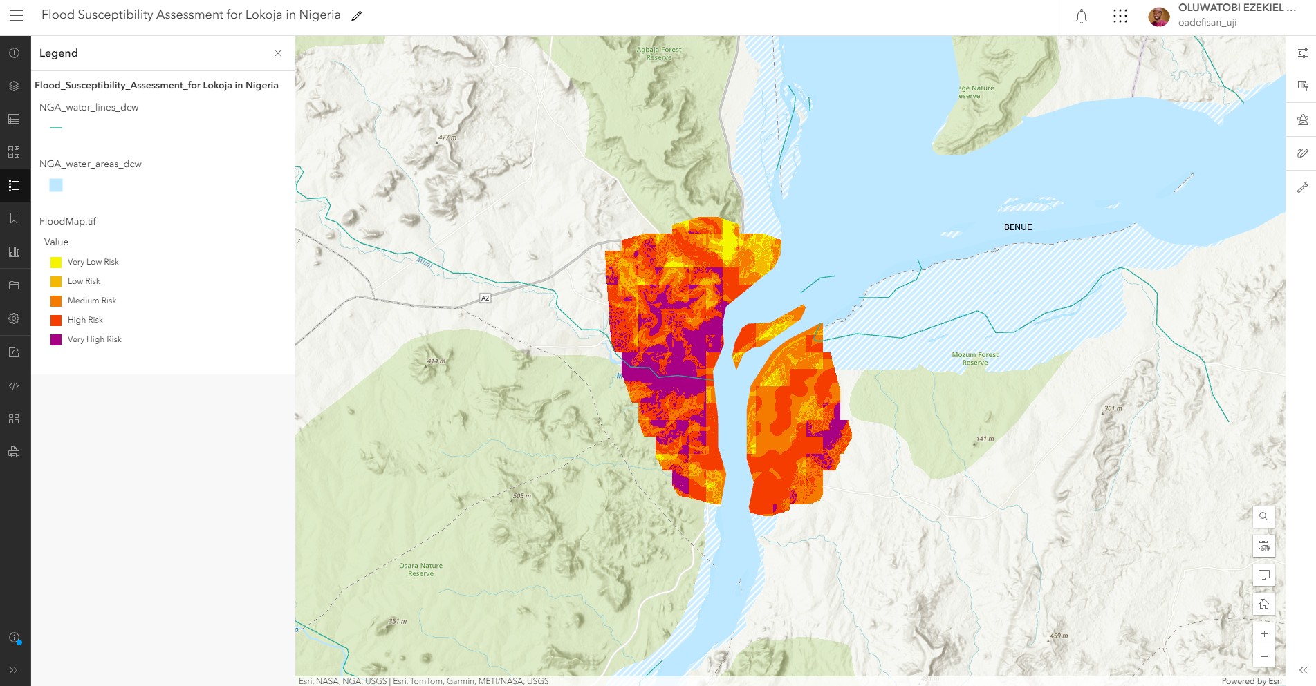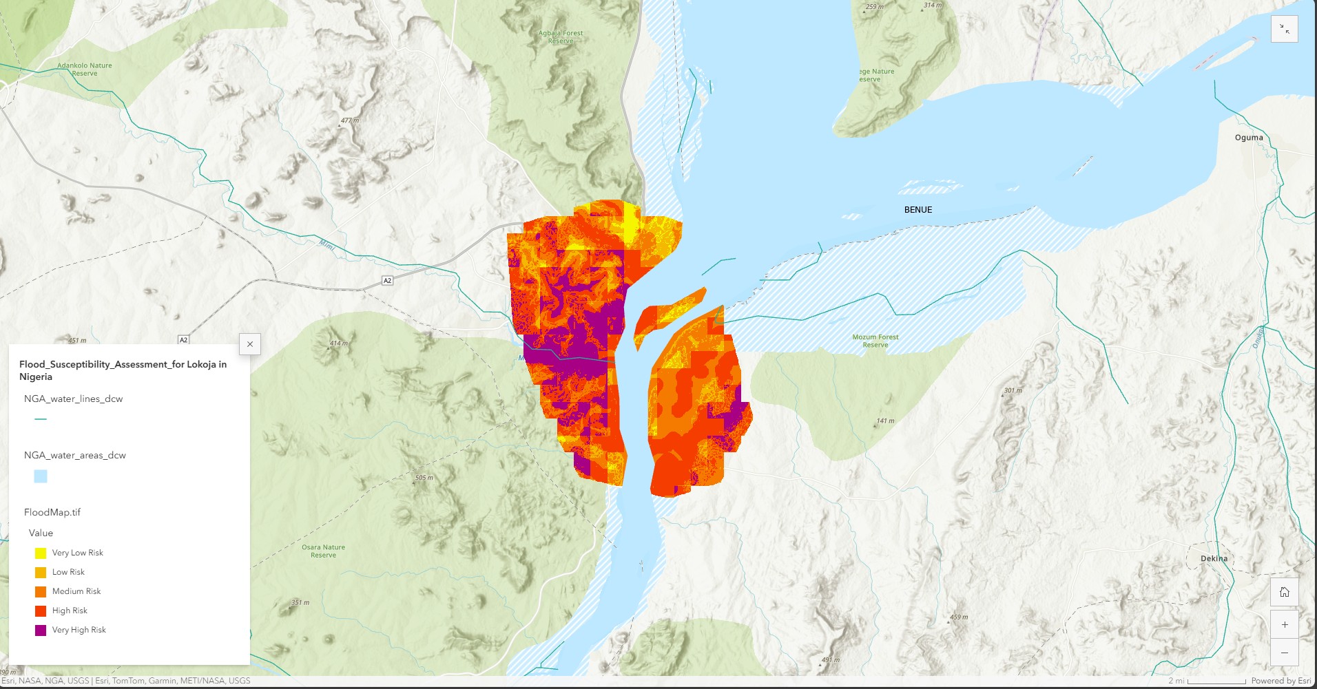 The flood susceptibility map for Lokoja (Figure 3) revealed that the city is highly susceptible to flooding, with large areas classified as high or very high risk. The map was created using a weighted overlay analysis, which involved assigning weights to each factor based on its contribution to flood susceptibility. The final map was classified into five categories, ranging from very low risk to very high risk susceptibility. The map also identified specific areas that are most vulnerable to flooding, including low-lying areas and areas with poor drainage systems. The findings of the project highlight the need for urgent action to address the city's flood vulnerability, including improving drainage systems and implementing flood mitigation strategies.